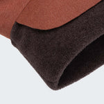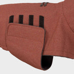 A winter dog coat with a comfortable fit, warmly lined with fleece and finished in rust red with a brown fleece collar, made from waterproof, easy-care, and wipe-clean fabric.