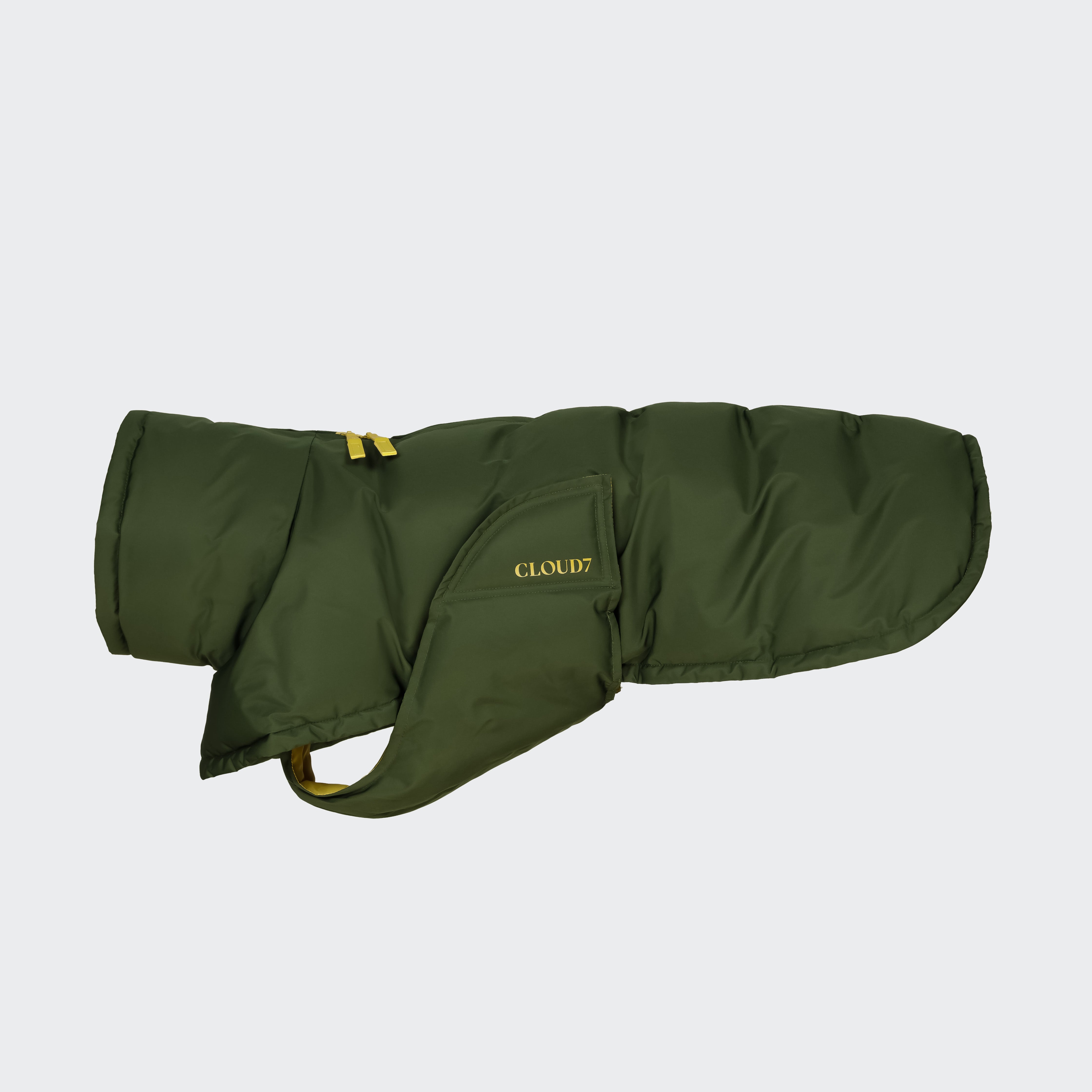 Extremely warm and functional winter coat for dogs in olive green with highly water-resistant materials and leg elastic bands to secure the fit.