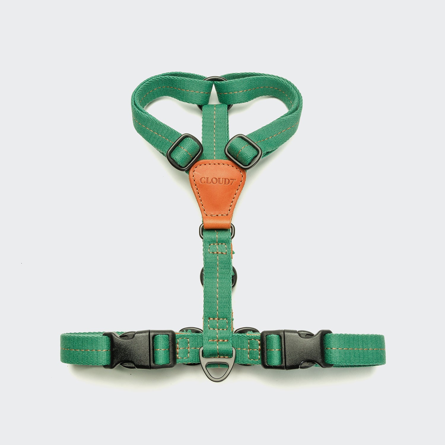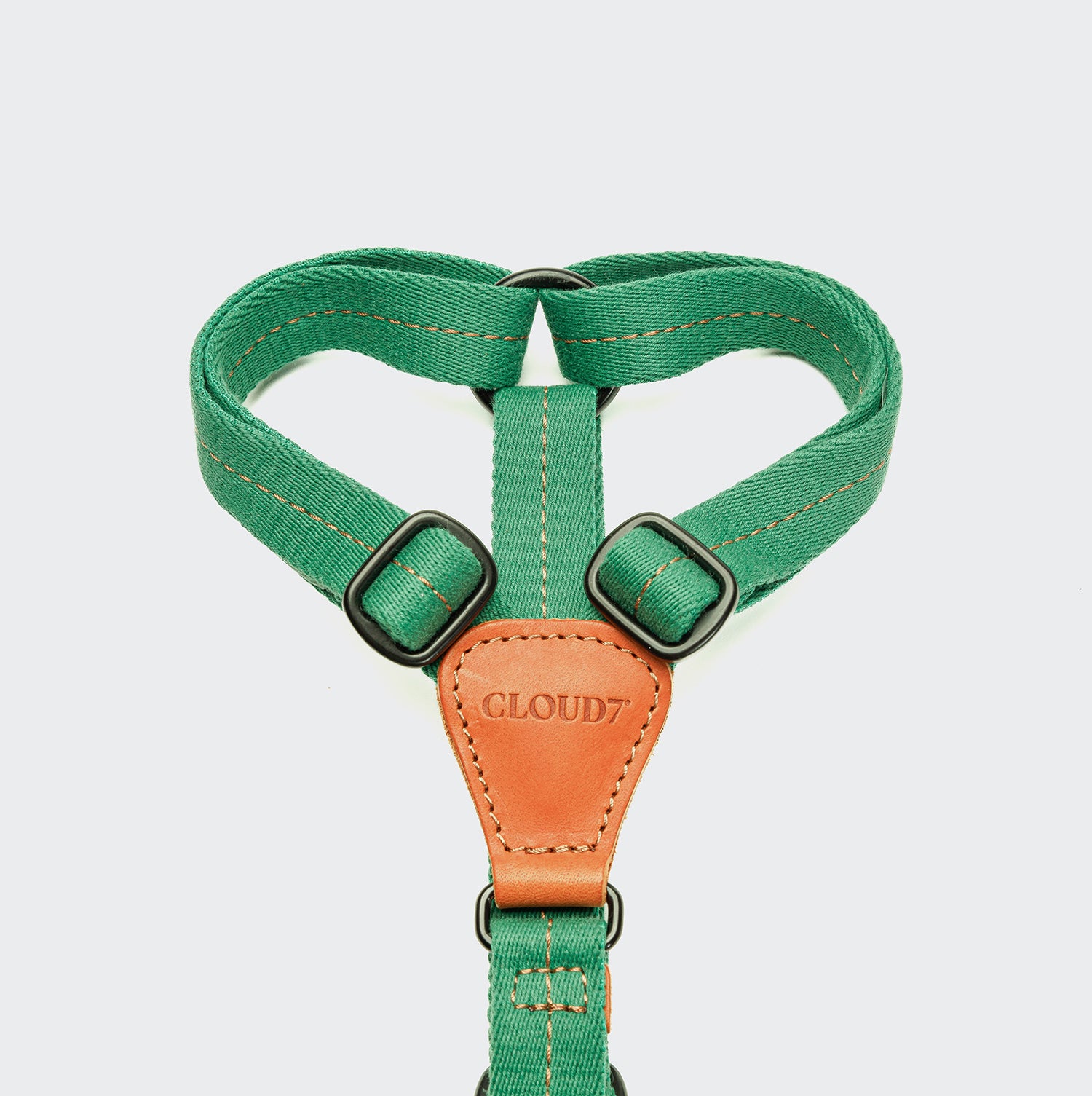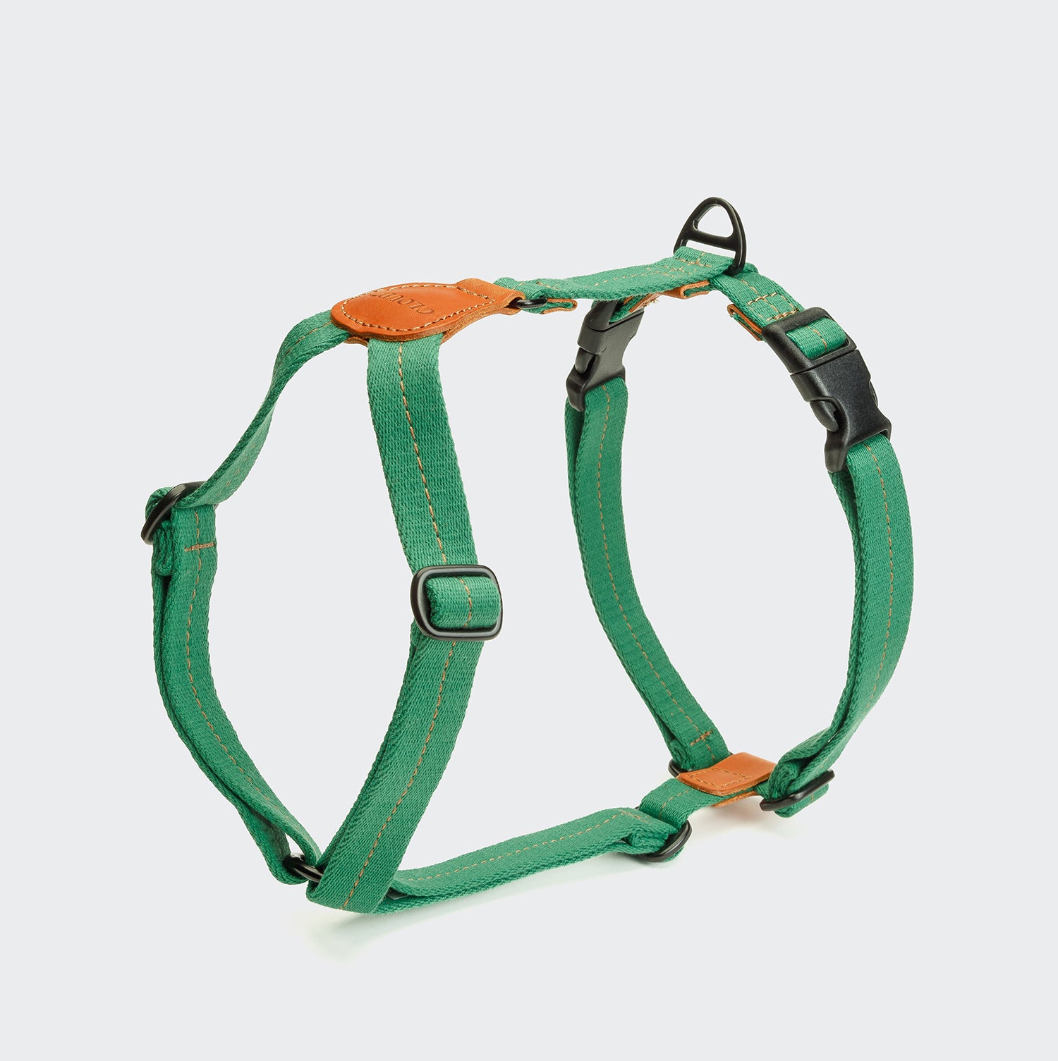 A bright and colourful dog collar, harness and leash collection for your pack walks. The highly durable cotton webbing with the contrasting stitching is combined with vegetable-tanned leather for a fresh rounded design. Minimalist black hardware made of durable steel allows for a sleek design and PVC keeps it lightweight enough for small dogs. The harness can be adjusted in several places to provide the perfect fit for every dog.The advantage of a Y-harness for dogs is the optimal pressure distribution in the chest area compared to the collar when the dog pulls on the lead.