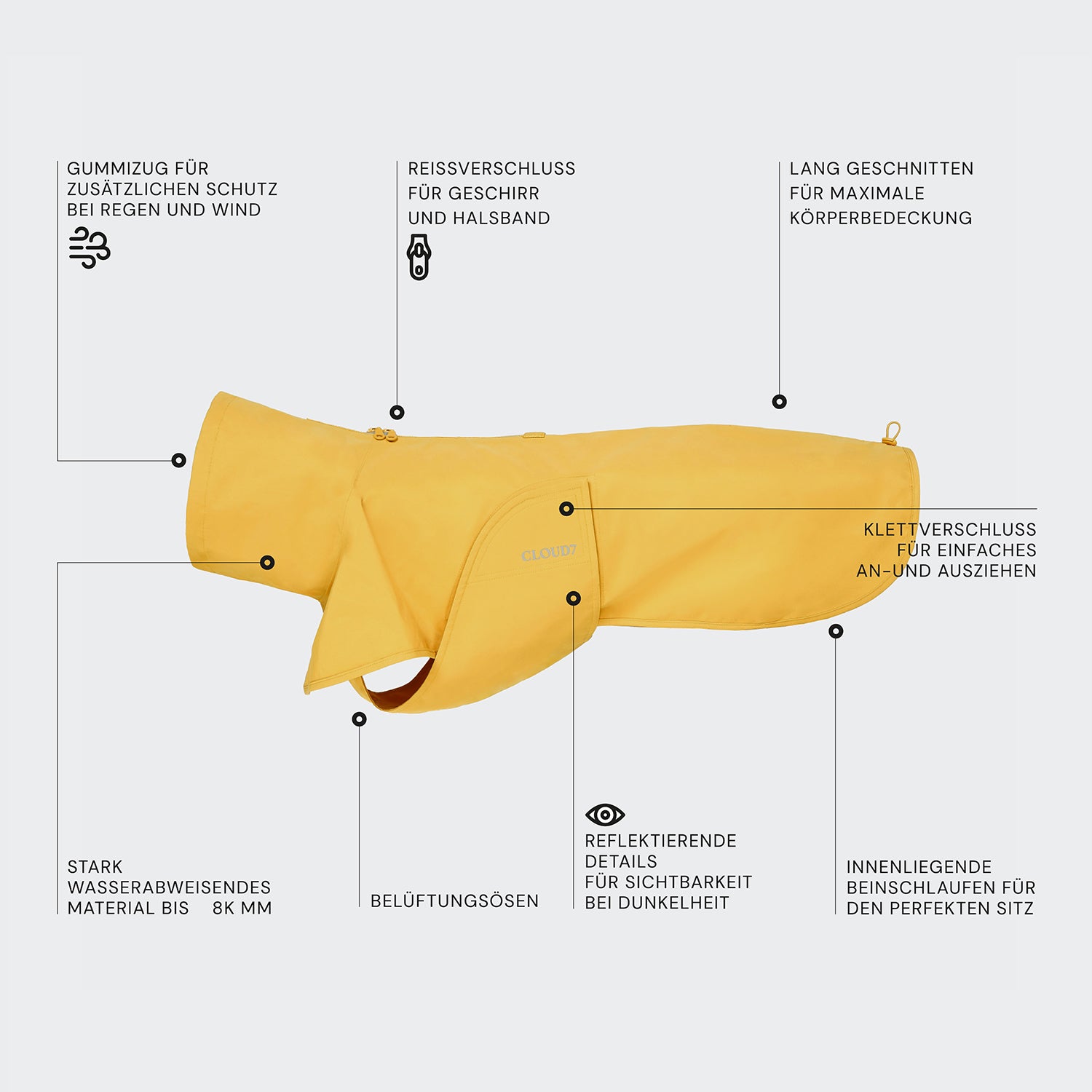 Weatherproof yet breathable dog raincoat for the rainy season. Featuring an extended design to provide optimal coverage of the body, long two-way zipper for easy access to harnesses and collars as well as an additional tag to attach a safety light such as Orbiloc® in low light days. The detailing of a storm collar, taped seams and ventilation eyelets ensure that the dog stays dry despite heavy rainfall. Built-in elastic bands for the hind legs allow the raincoat to stay in place during runs and plays, whereas the elastic cord near the rear allows the length to be adjusted for a tailored-like fit.