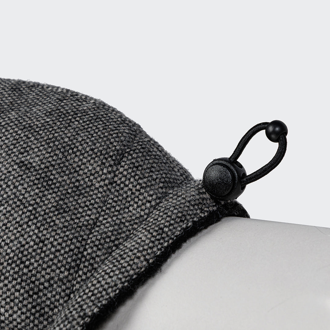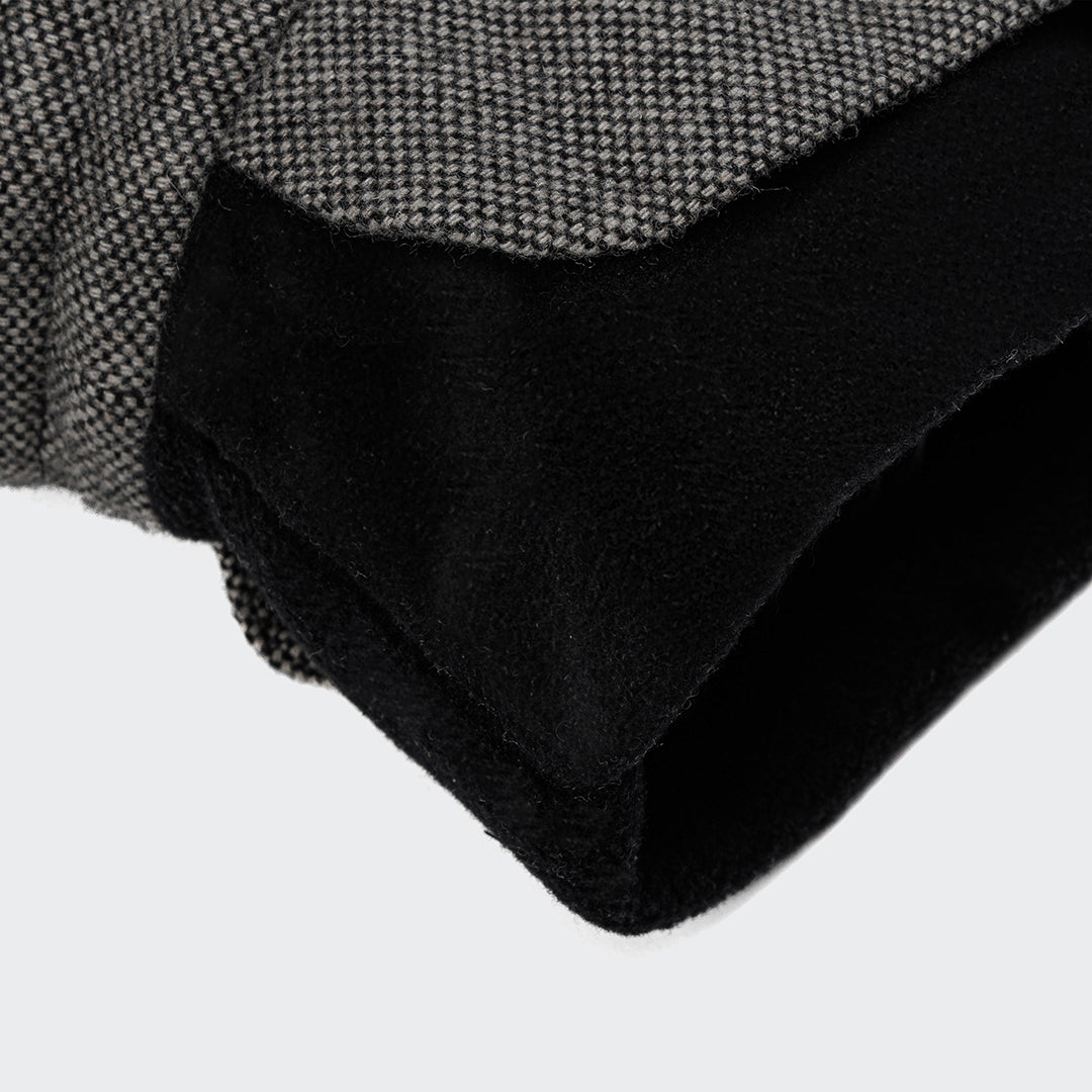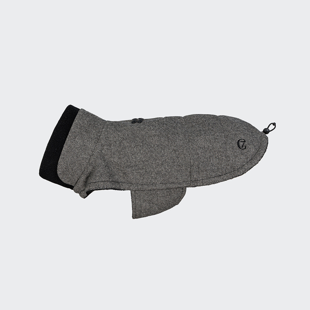 A dog coat specially designed for French Bulldogs with a comfortable fit, warmly lined with fleece, and finished with a waterproof, easy-care tweed fabric from Italy in black.
