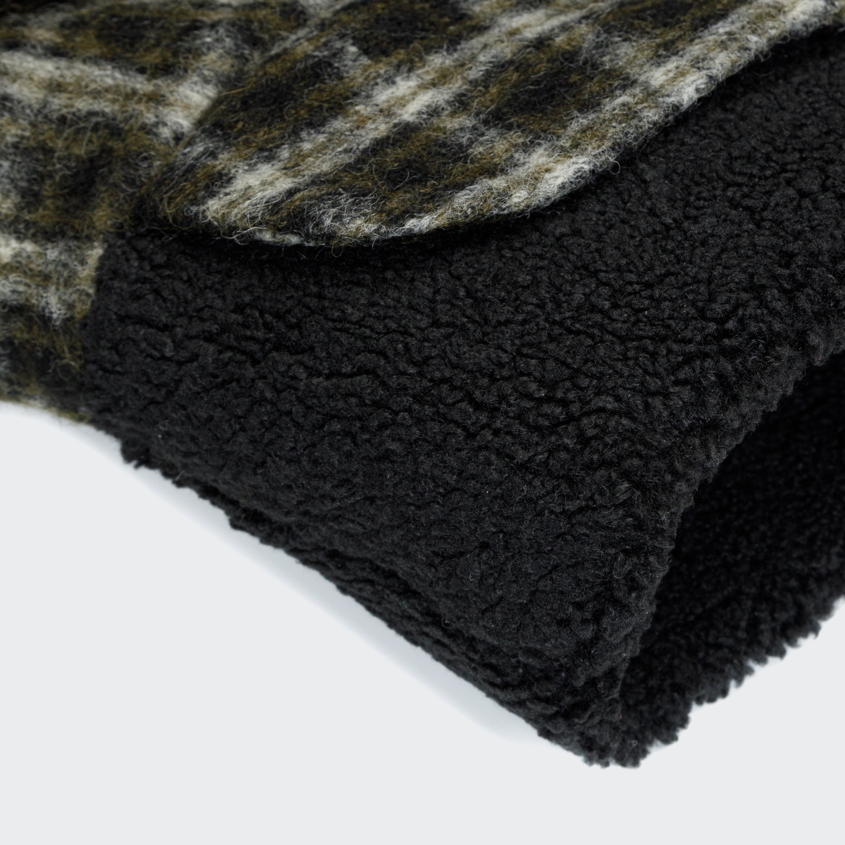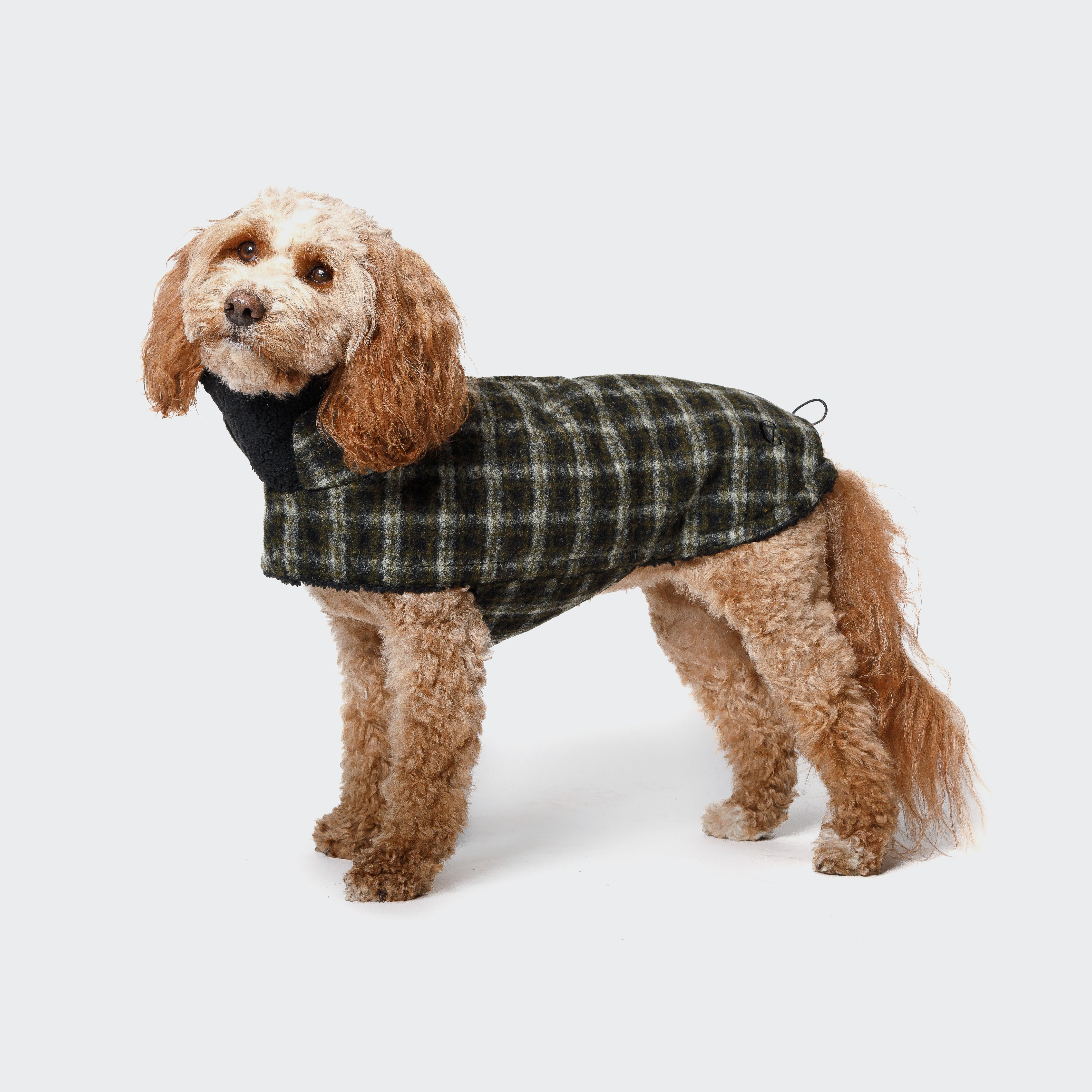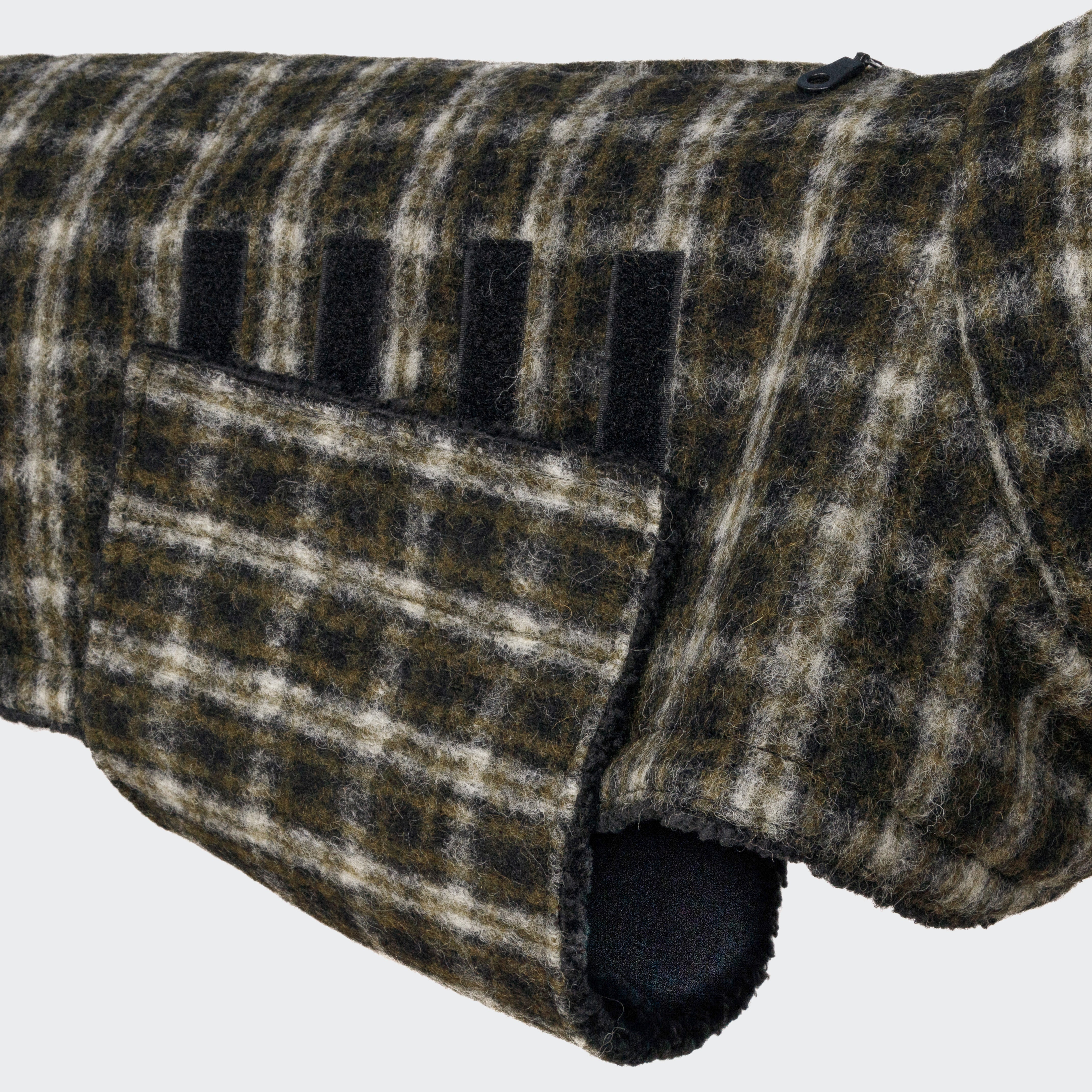 A dog winter coat with a comfortable fit, lined with warm black teddy fabric and finished with a highly water-repellent, tear-resistant fabric in a Scottish check look in green and black.