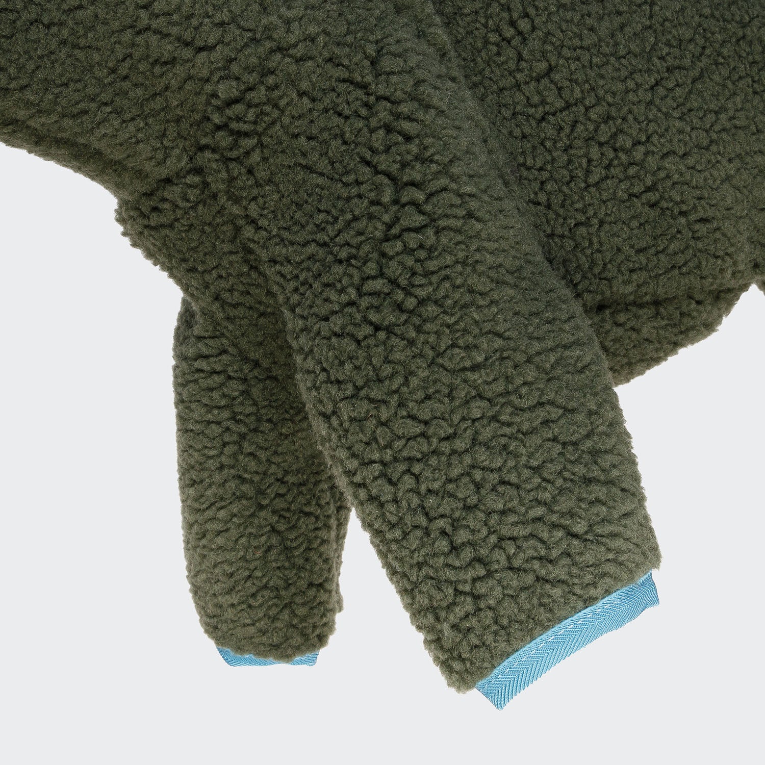 Warm full-body teddy-look dog sweater for French Bulldogs in a teddy look in olive, which also covers the legs. The cosy bodysuit with belly protection has a special fit for Frenchies and muscular mixed breeds.