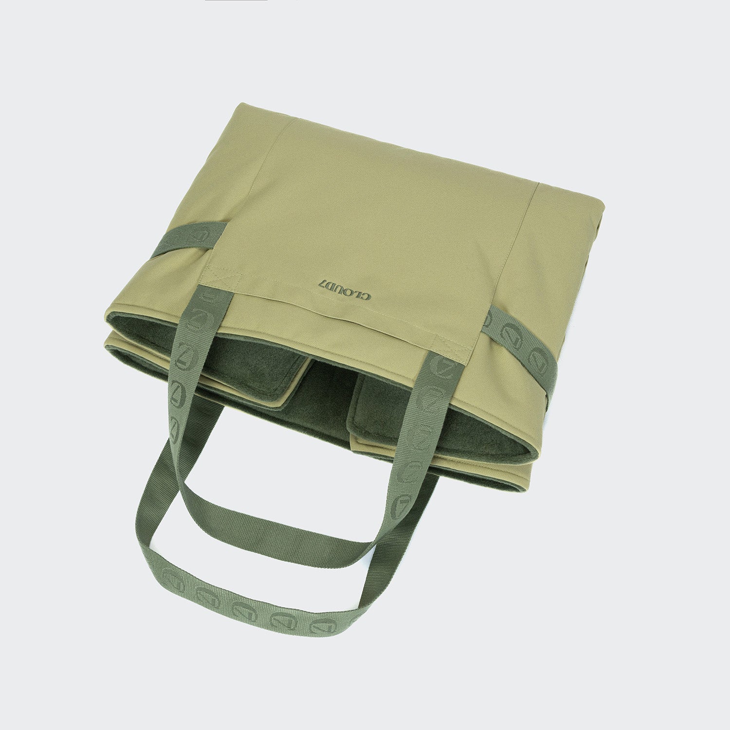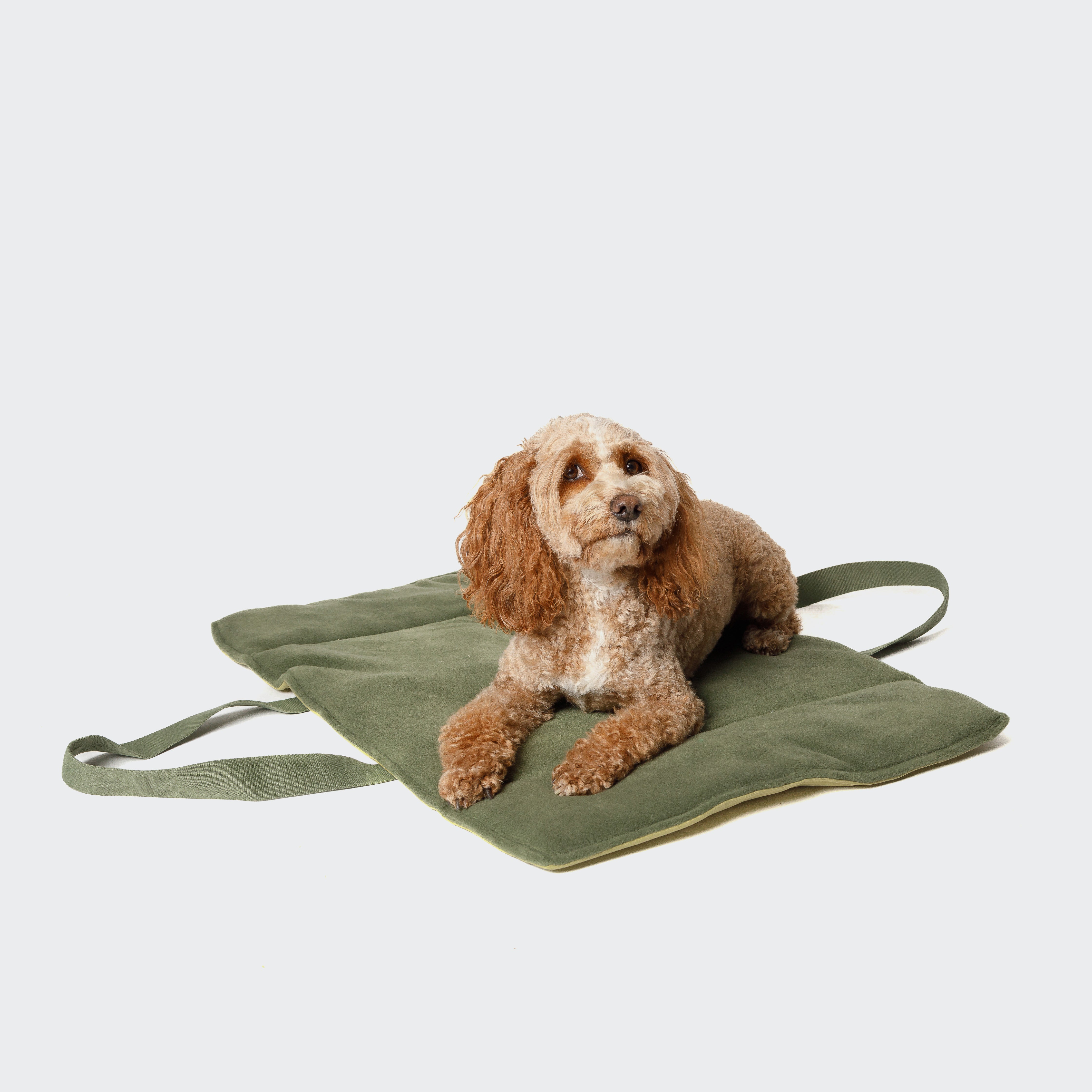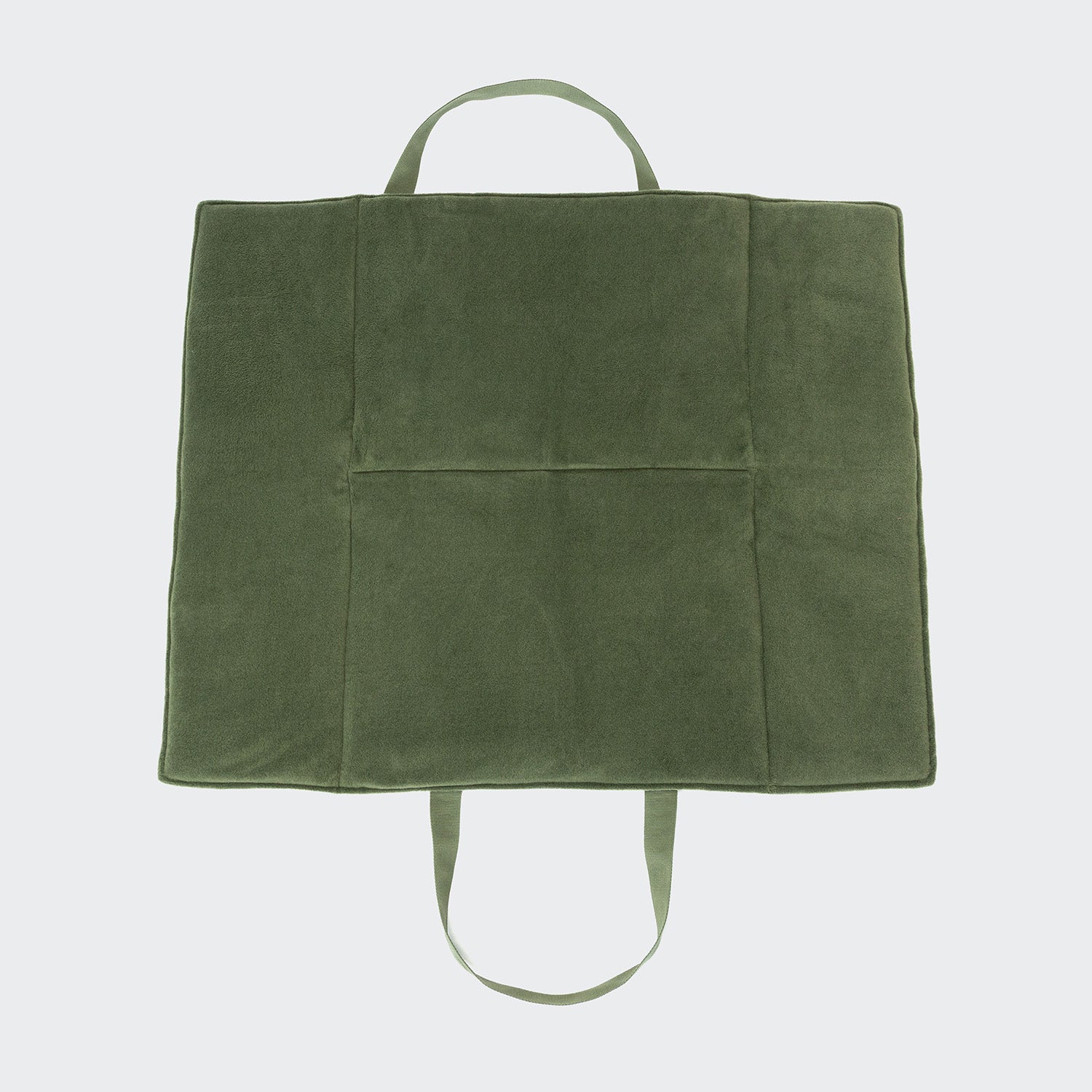 Foldable and water-repellent dog mat with a soft interior that can be conveniently folded up as a carrying bag in fresh pistachio green with longer handles for even better carrying comfort.