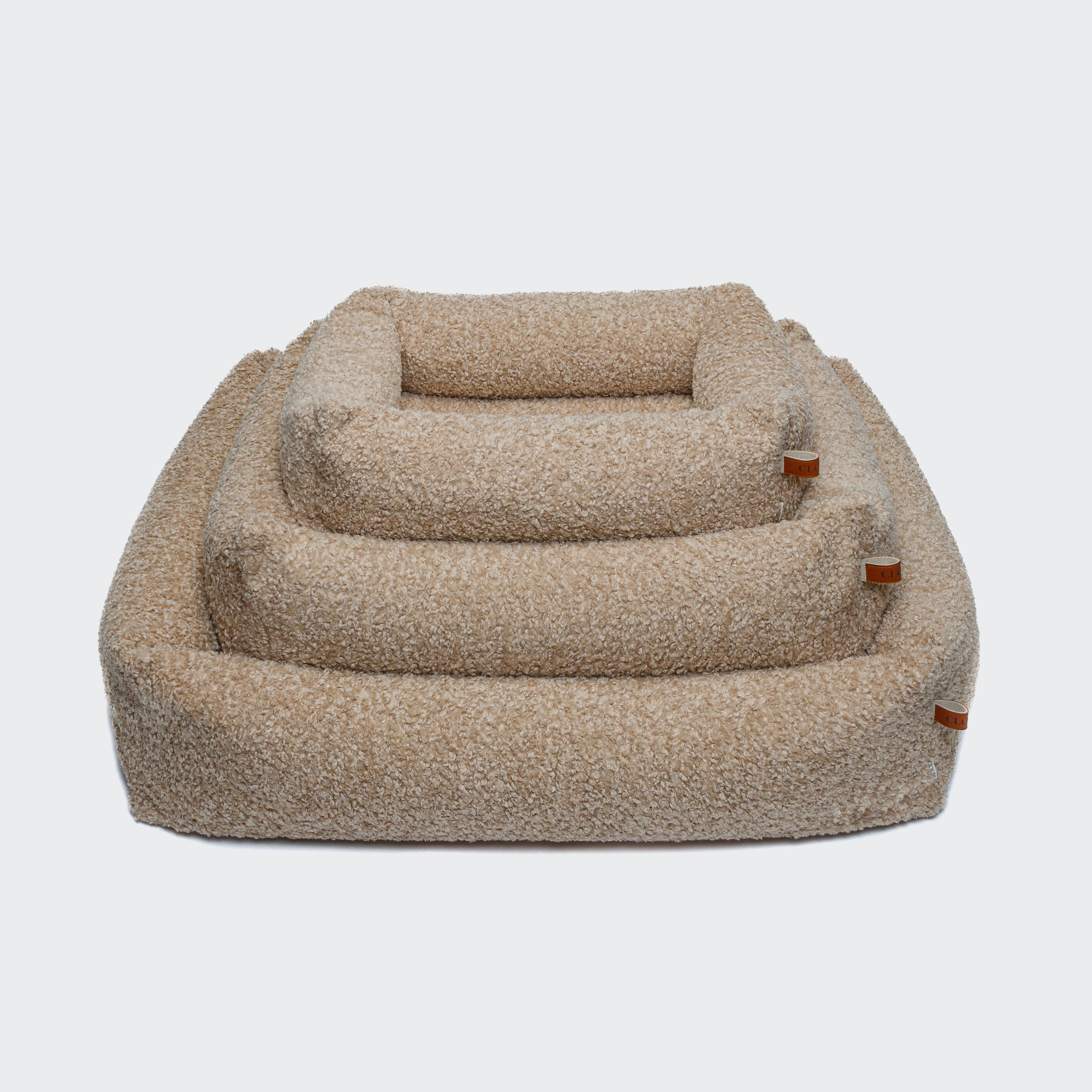 Langlebiges Hundebett mit Rand in kuscheligem Teddylook in Beige.
