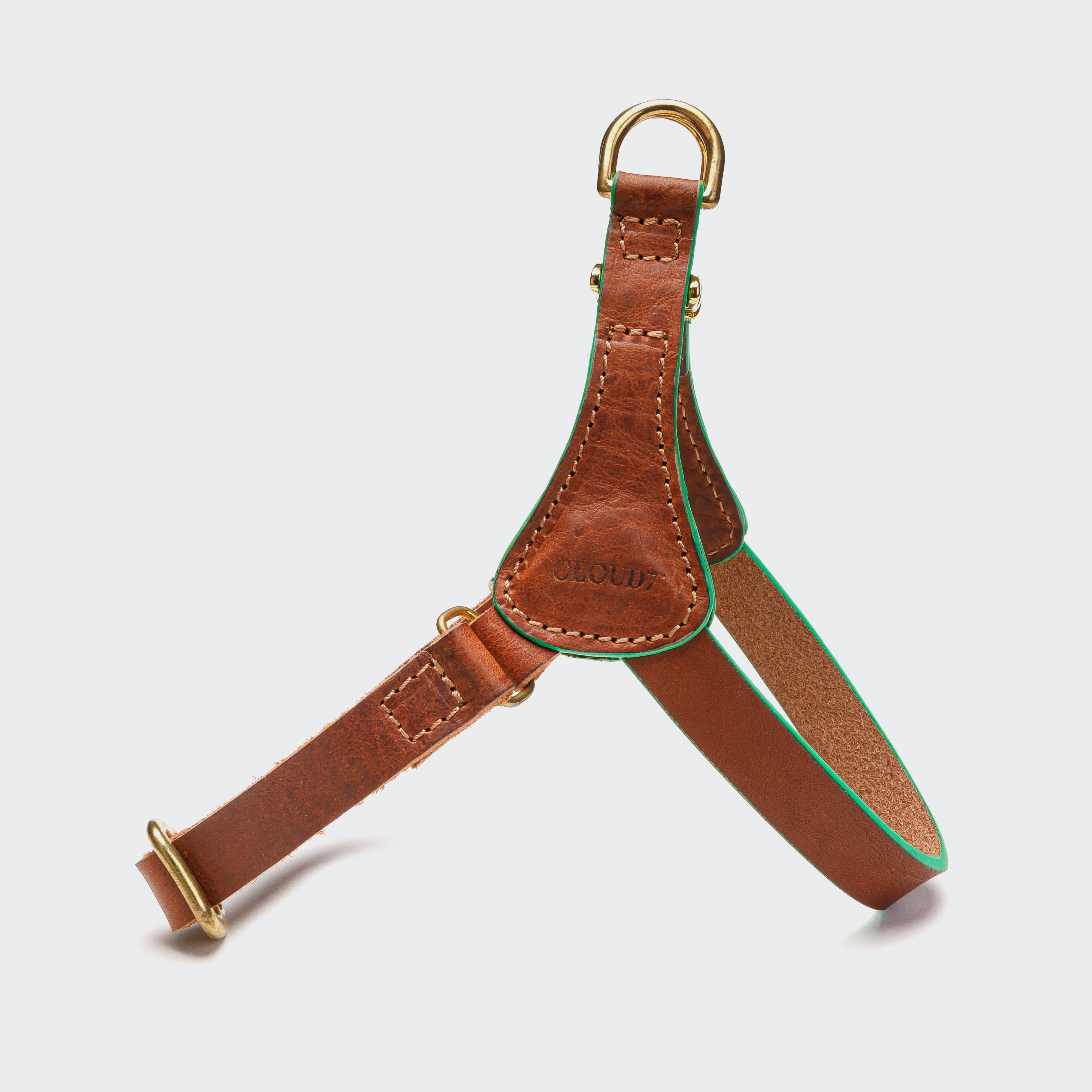 Weiches Lederhundegeschirr für Mini- und kleine Hunde aus pflanzlich gegerbtem Rindsleder in Cognac-Braun mit Kontrastdetails in knalligem Grün.