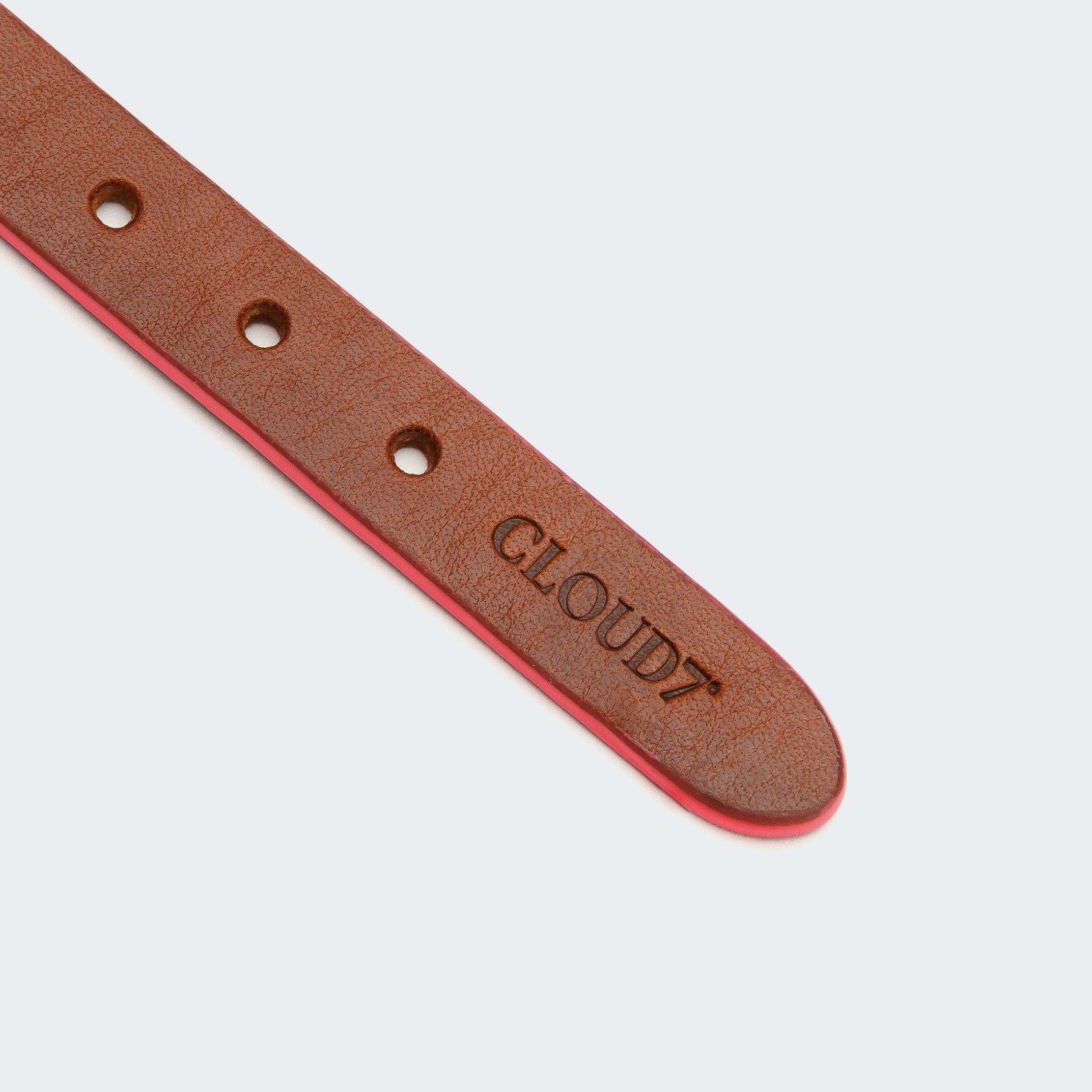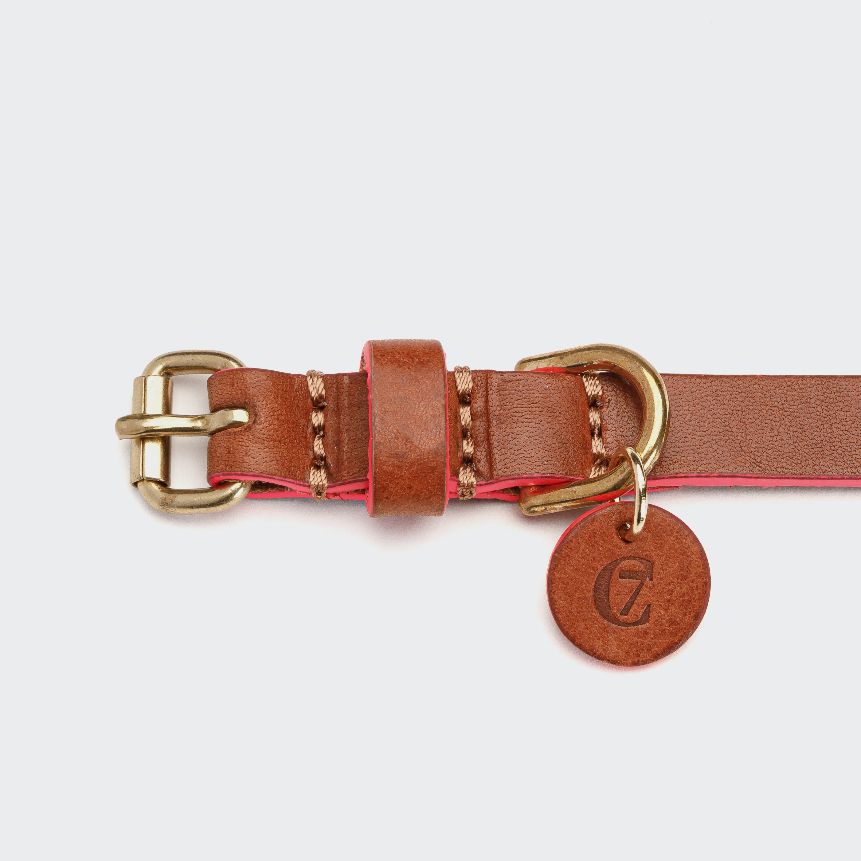 Lederhalsband für Mini- und kleine Hunde aus pflanzlich gegerbtem Rindsleder in Cognac-Braun mit Kontrastdetails in knalligem Pink. Für große Hunde ist Kings Park empfohlen.