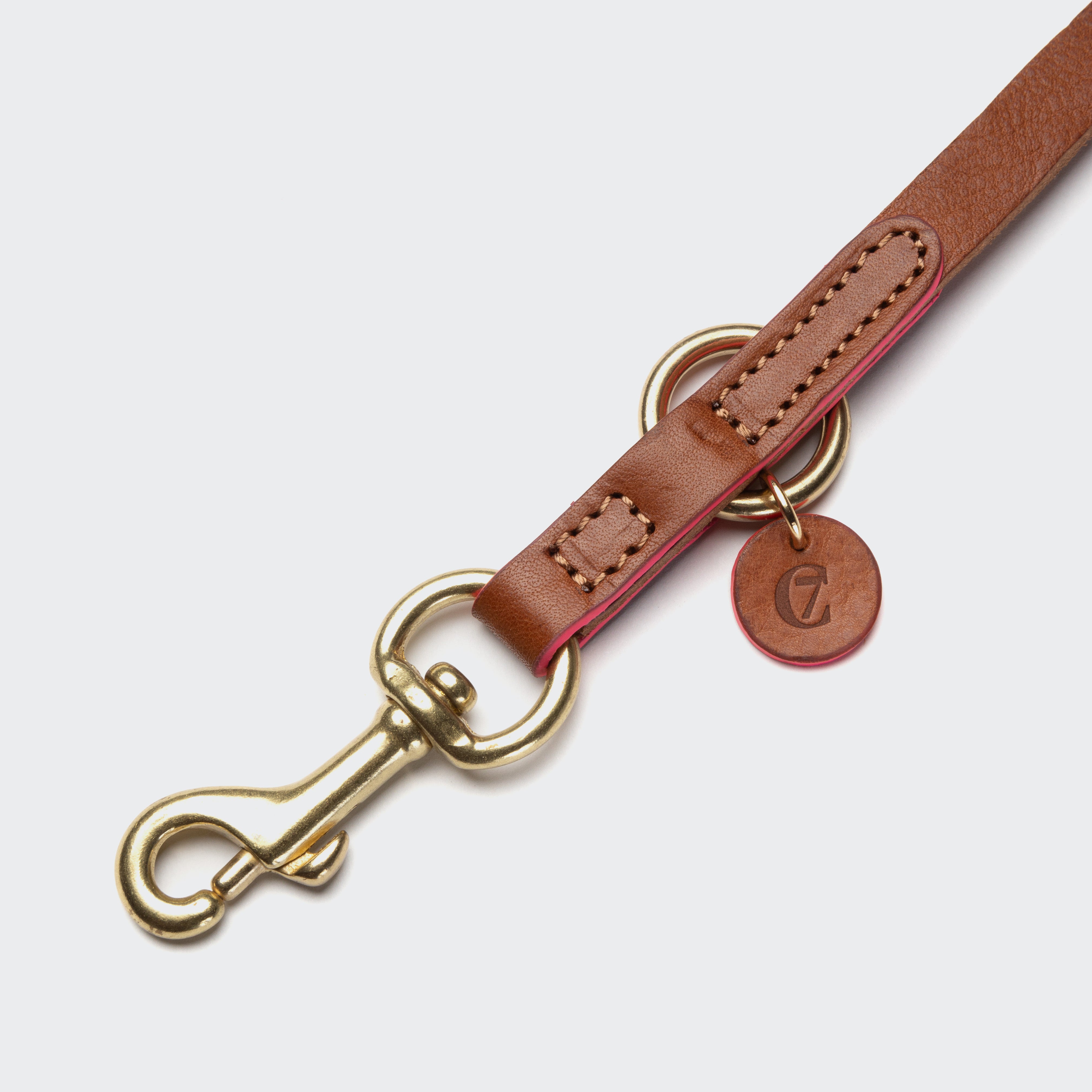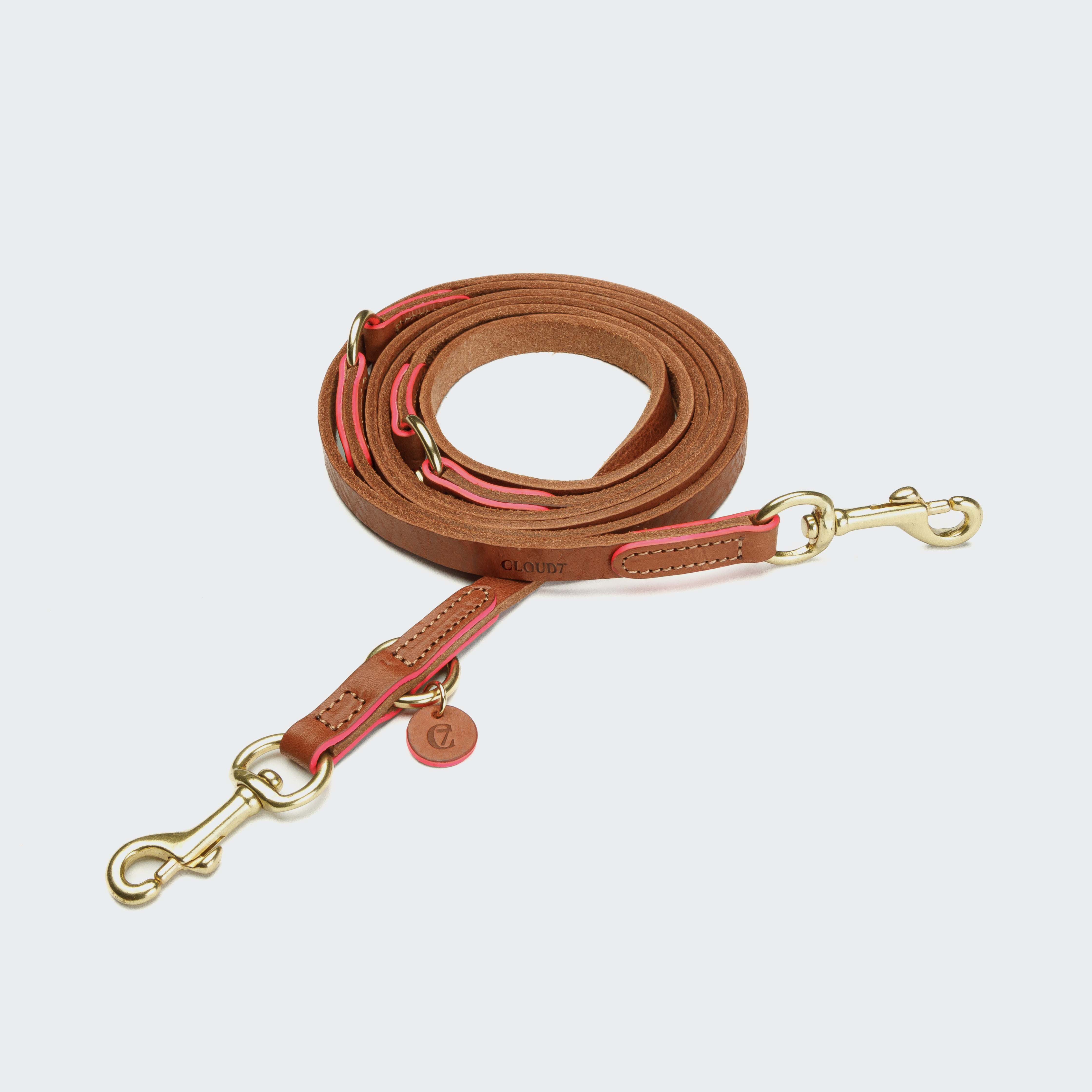 Längenverstellbare Lederleine für Mini und kleine Hunde aus pflanzlich gegerbtem Rindsleder in Cognac-Braun mit Kontrastdetails in knalligem Pink. Für große Hunde ist Kings Park empfohlen.