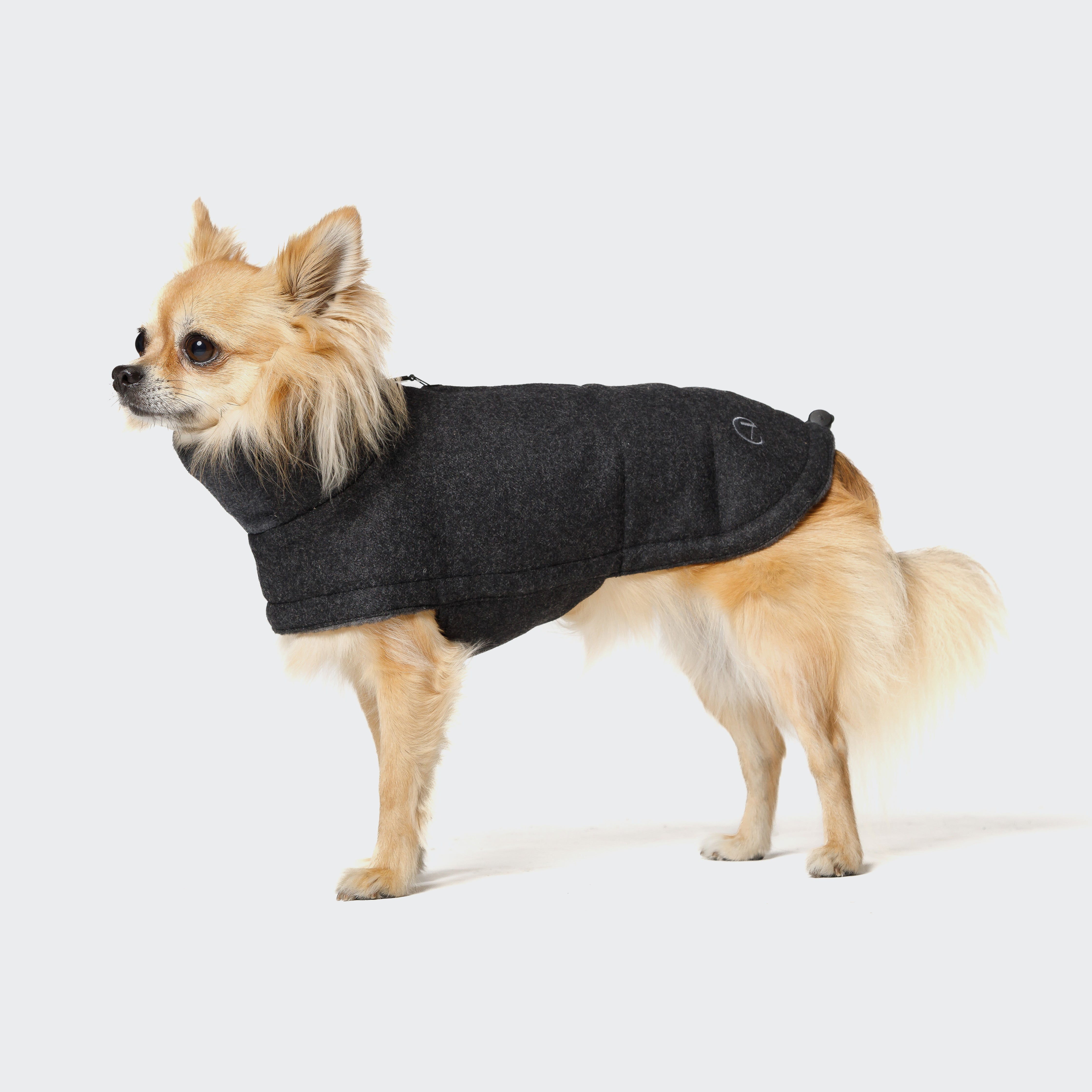 Ein Hunde Wintermantel mit bequemer Passform, warm mit Fleece gefüttert und vollendet mit einem stark wasserabweisenden, eleganten Wollmix in der limitierten Farbe Anthra.