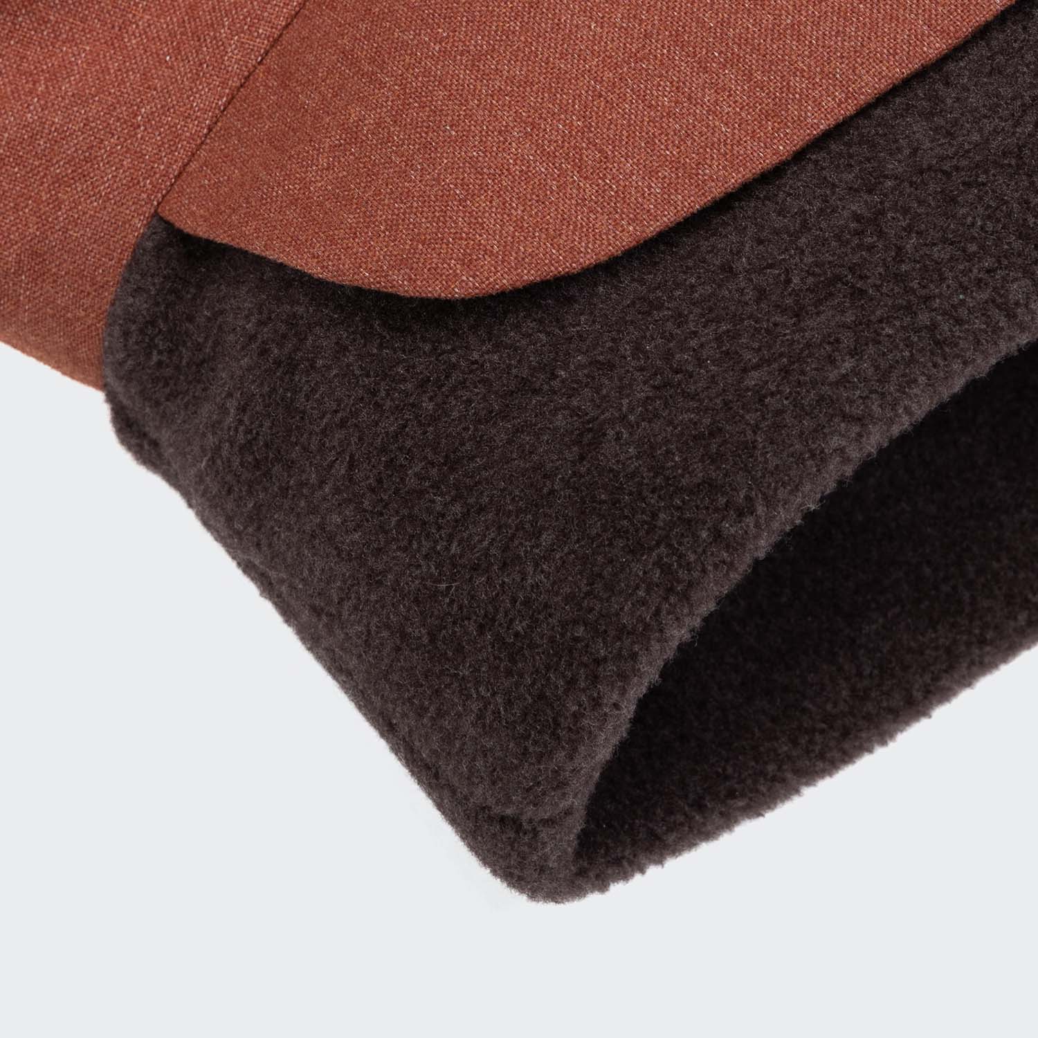 Ein Hunde Wintermantel mit bequemer Passform, warm mit Fleece gefüttert und vollendet mit einem wasserdichten, pflegeleichten und leicht abzuwischenden Stoff in Rostrot mit braunem Fleece Kragen.