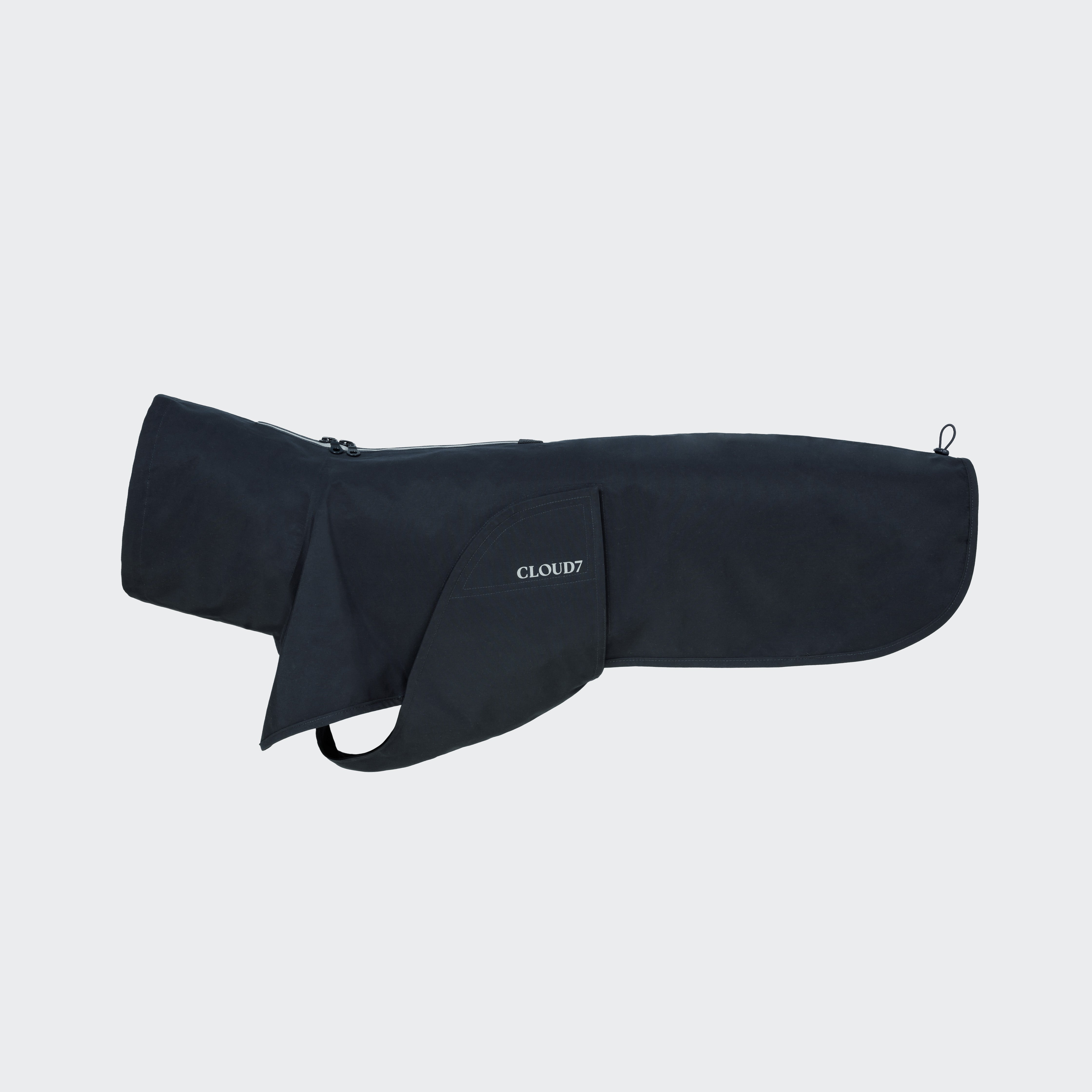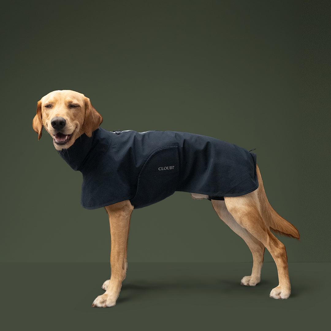 Stark wasserabweisender Regenmantel für Hunde mit längerem Schnitt und Befestigungsmöglichkeit an den Hinterbeinen für maximalen Schutz vor Wind und Regen.